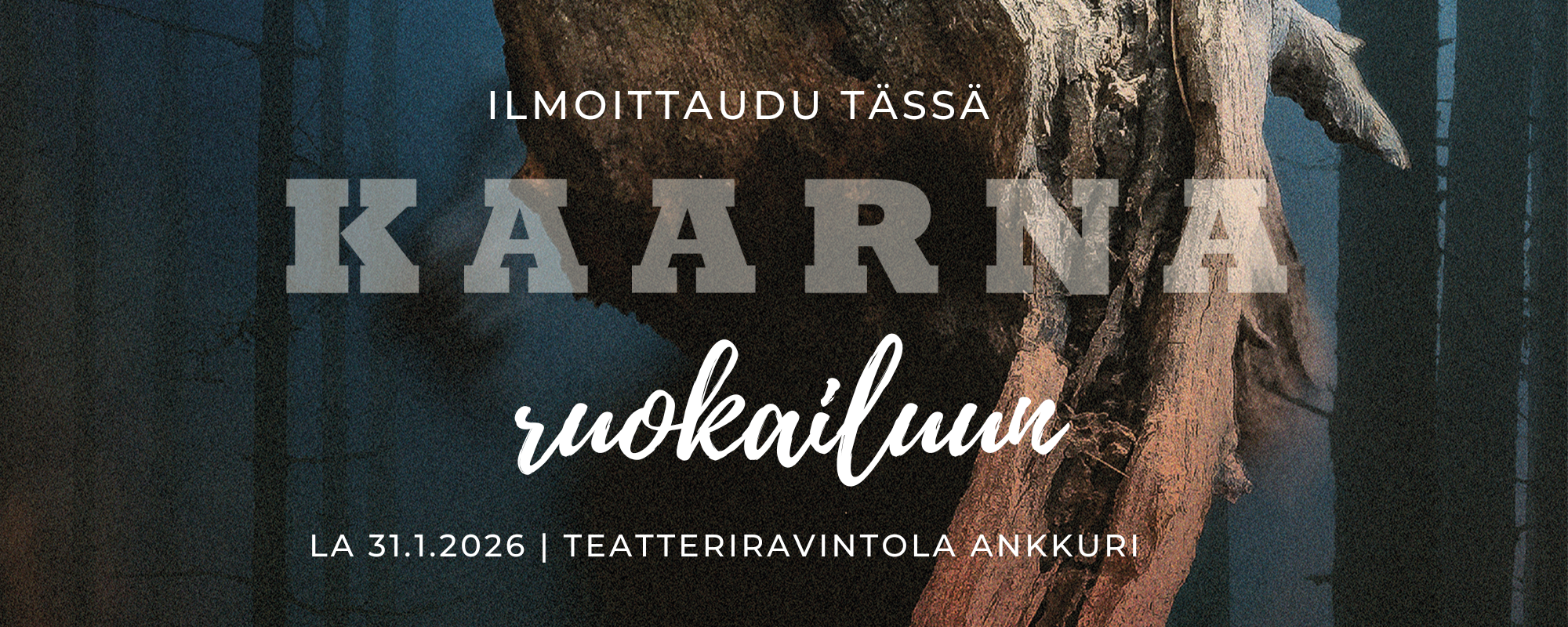 Ilmoittaudu tällä lomakkeella Kaarna -ensi-illan ruokailuun. Ruokailuun voi tuoda avo-/aviopuolisonsa/elämänkumppaninsa (= henkilökunnan jäsen + avec), muista mahdollisista ruokailijoista on maksettava 20€ ruokailumaksu (maksetaan ravintolaan ruokailun yhteydessä). Huomaathan, että tämä lomake on tarkoitettu vain henkilökunnan täytettäväksi!